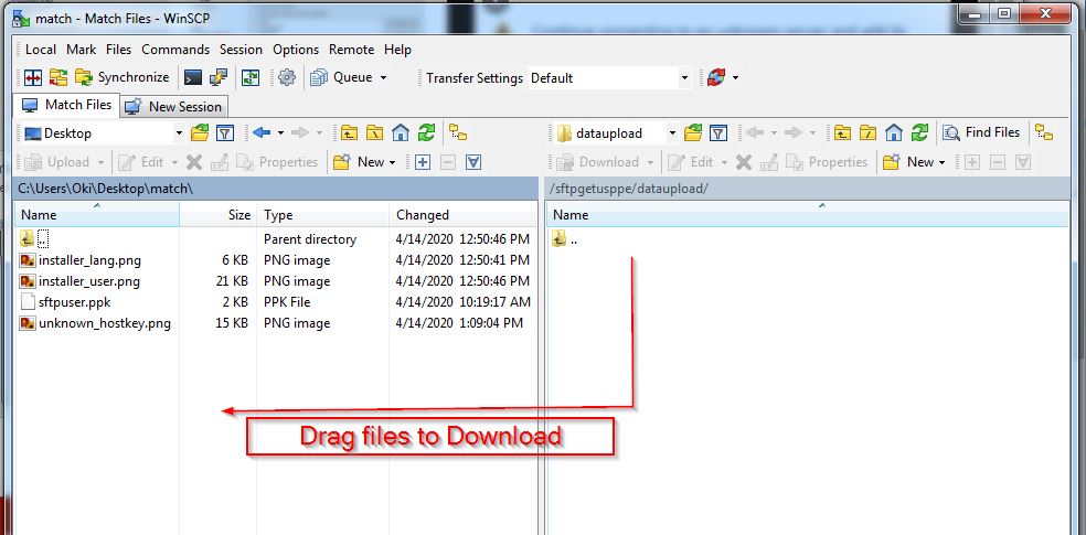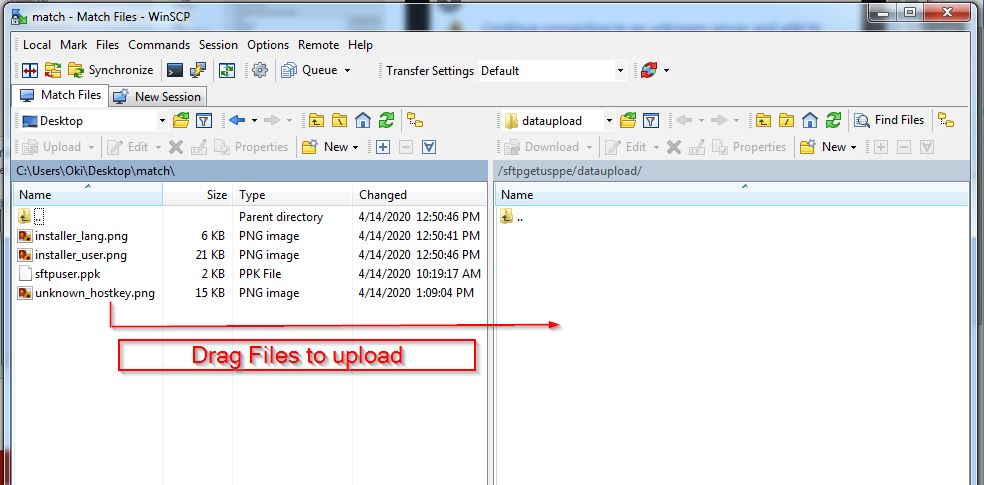 To upload files, simply drag files from your computer (left side) to the server end (right side)