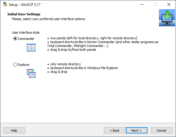 Then you will be prompted for Initial User Settings, keep default Commander interface.