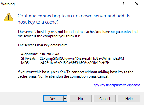 A whole bunch of text will appear and if this is the first time you connect to this server, it will ask you to add a host key. Click Yes.